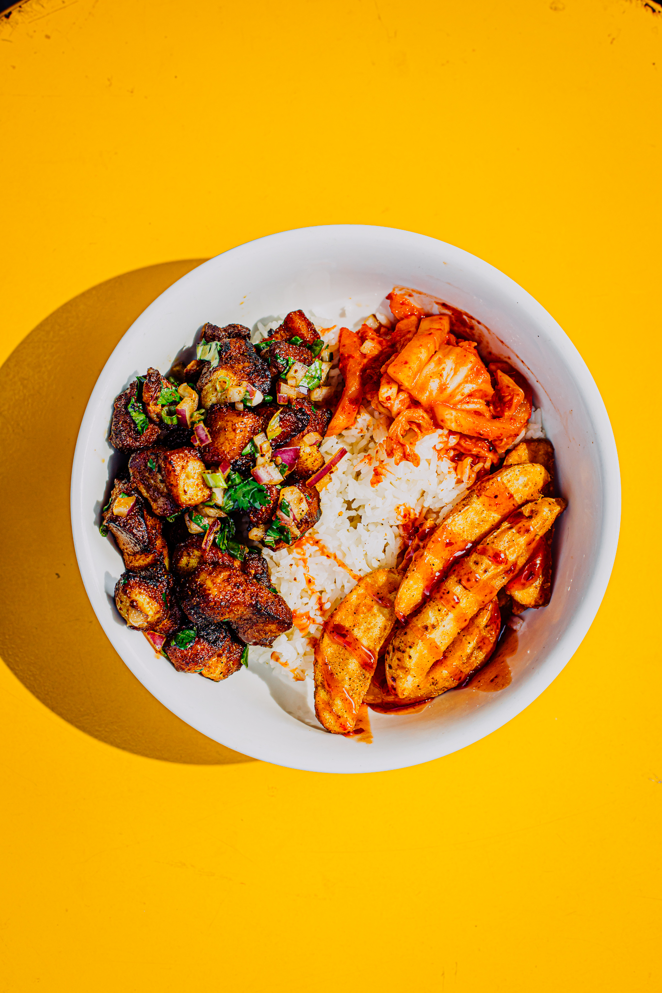Rice, sekuwa, potato wedges, sweet pickled radish & carrots, sweet chili sauce